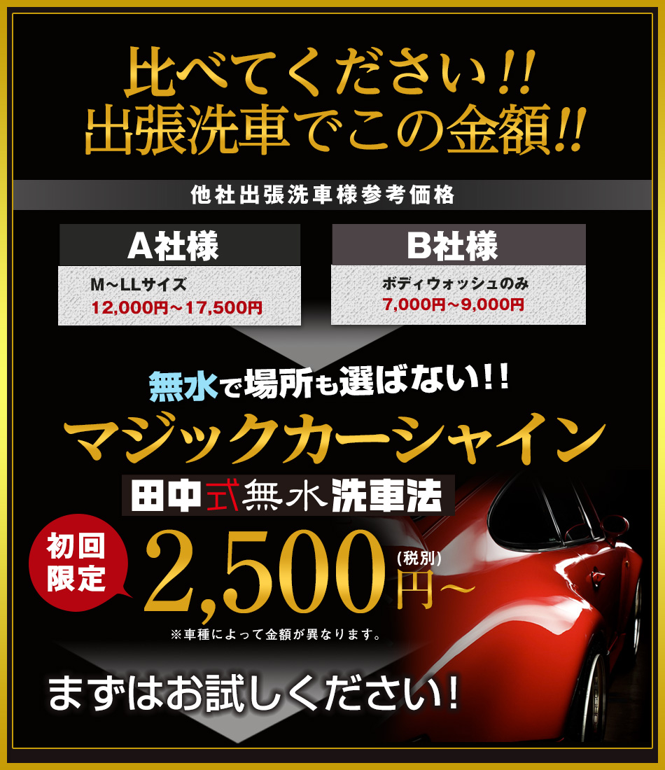 田中式無水洗車法の最大の特徴が水を1滴も使わないこと!洗車のプロですので傷や拭き残しの問題が一切ないのは当たり前!水道の設備も不要で、作業スペースが狭くても( 横幅60㎝以上 )対応可能です!