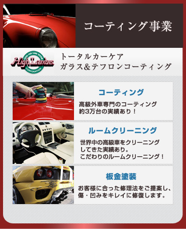 これまであらゆる高級車・旧車・外国車・国産車を扱ってきたコーティング&洗車のエキスパート、ハイランダー。そのハイランダーが行う田中式無水洗車法だからこそ環境に優しく、経験も知識も豊富だと安心してご依頼頂いております。
